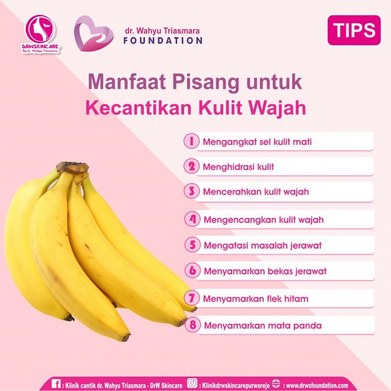 Pisang dapat membantu mencerahkan kulit wajah. Buah pisang mengandung antioksidan yang mampu merawat kulit agar tetap sehat terjaga. Selain itu, rajin menggunakan masker pisang dapat membantu mencerahkan kulit wajah.